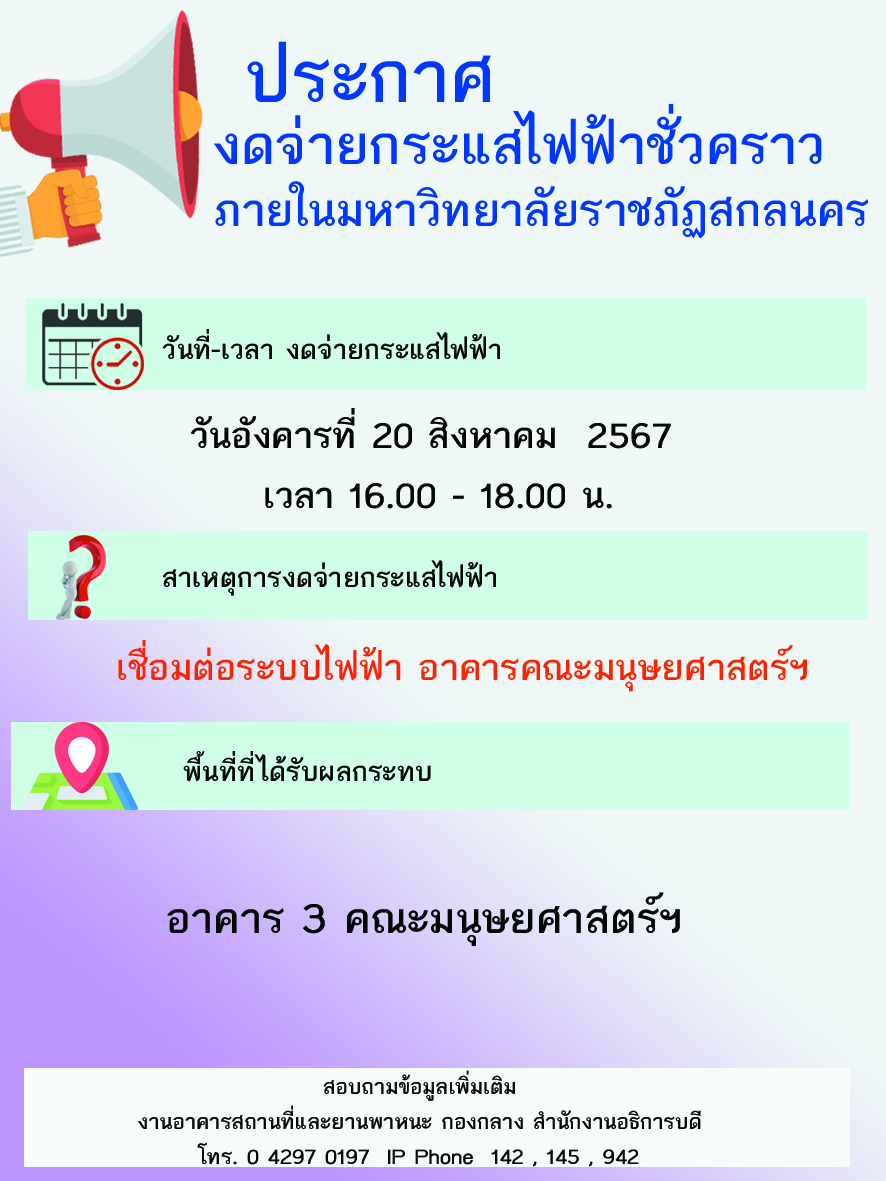 งดจ่ายกระแสไฟฟ้า 20.08.2567 Posted on สิงหาคม 19, 2024สิงหาคม 19, 2024 by งานอาคารสถานที่และยานพาหนะ ← Previous Next →